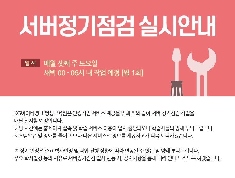※ 서버점검은 매월 셋째 주 토요일 진행하나 학사일정 등에 따라 변동이 있을 수 있습니다.