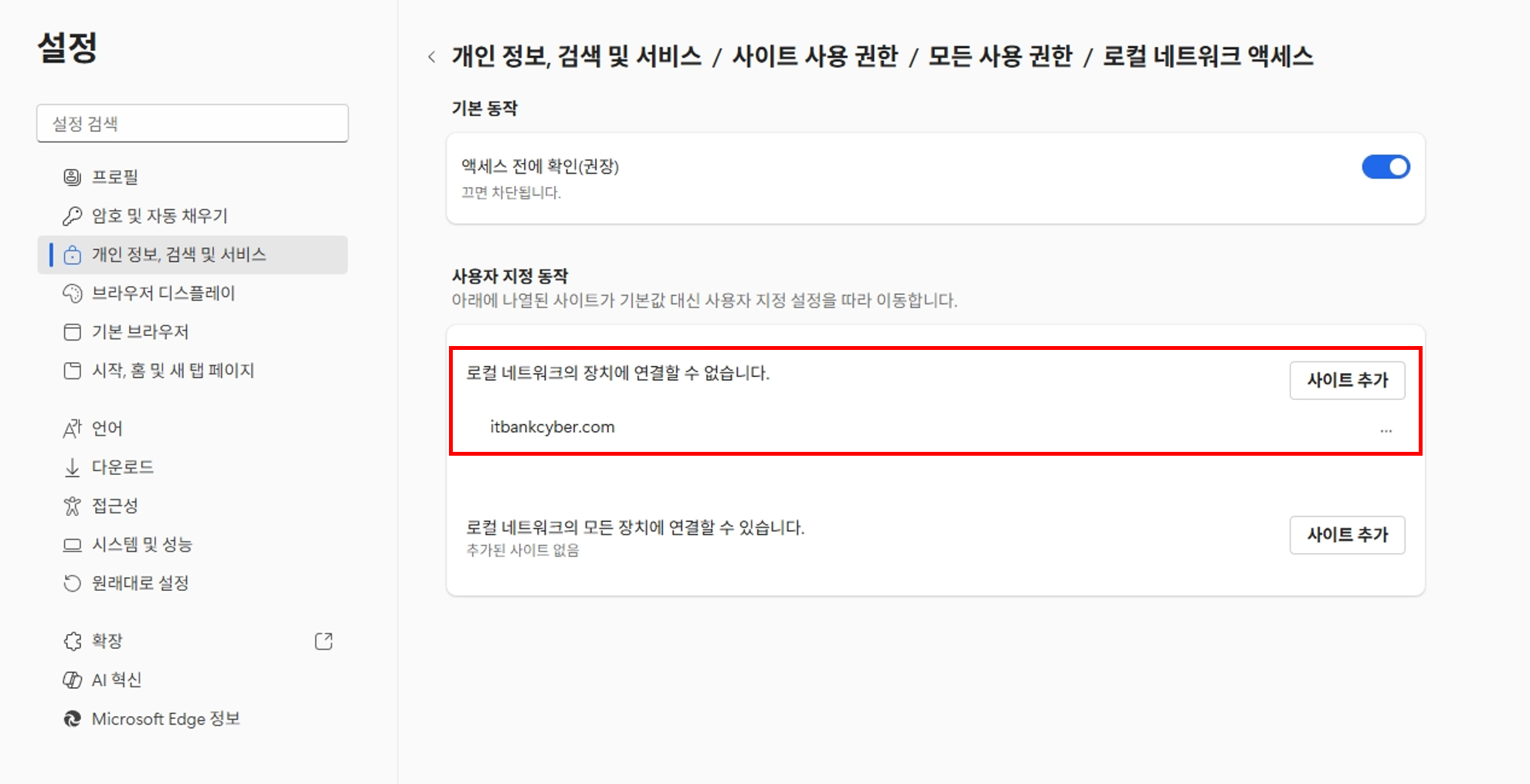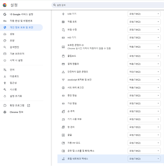 경로 : [브라우저 설정 → 개인정보, 검색 및 서비스 → 사이트 사용 권한 → 모든 사용 권한 → 로컬 네트워크 액세스]
