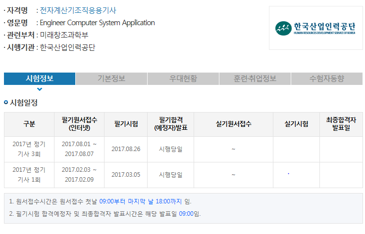 2017년도 전자계산기조직응용기사 시험일정 안내입니다.