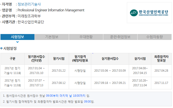 2017년도 정보관리기술사 자격증 시험일정 안내입니다.