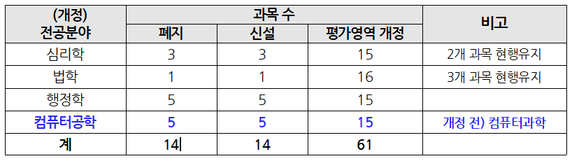 가. 4개 전공 분야(심리학, 법학, 행정학, 컴퓨터과학)의 총 75개 과목을 다음과 같이 개정함.