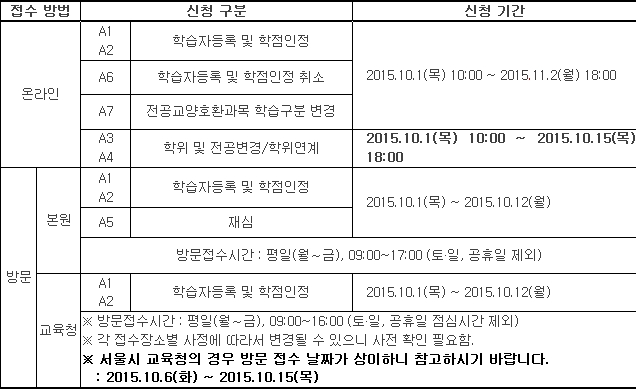 - 외국교육기관 이수자의 학습자등록은 접수기간 중 방문접수에 한함(온라인 접수 불가).