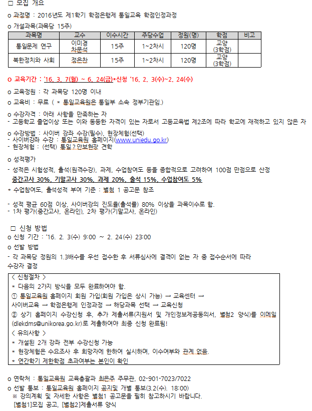 2016-1 정부교육기관 운영(통일부 소속 통일교육원) 학점은행 교육프로그램 안내