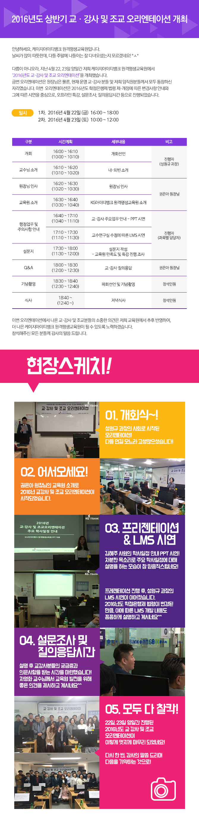공지사항 학점은행제 소식 우리원 소식 이벤트 소식 수강후기 우리원소식 게시글 상세보기 2016년도 상반기 교강사및조교 1차 오리엔테이션 개최[현장영상첨부] 관리자 | 추천 0 | 반대 0 | 조회 4582 | 2016-05-11 오후 1:33:09 ▼ 덧글 0개 ▲ top